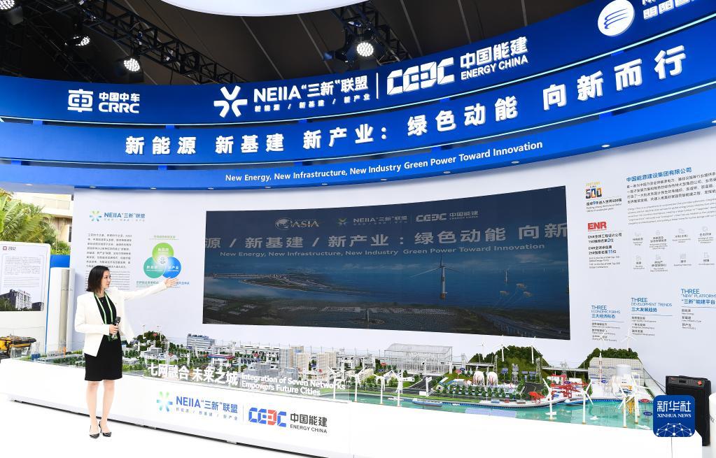 3月29日,中國能建參展人員介紹“新能源 新基建 新產(chǎn)業(yè):綠色動(dòng)能 向新而行”展臺。