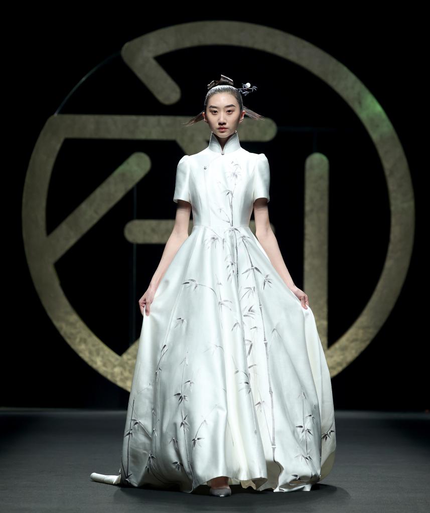 3月30日,在北京舉行的中國國際時(shí)裝周2023秋冬系列“六禮·張效奇”時(shí)裝發(fā)布上,模特展示時(shí)裝設計師張效奇設計的時(shí)裝。