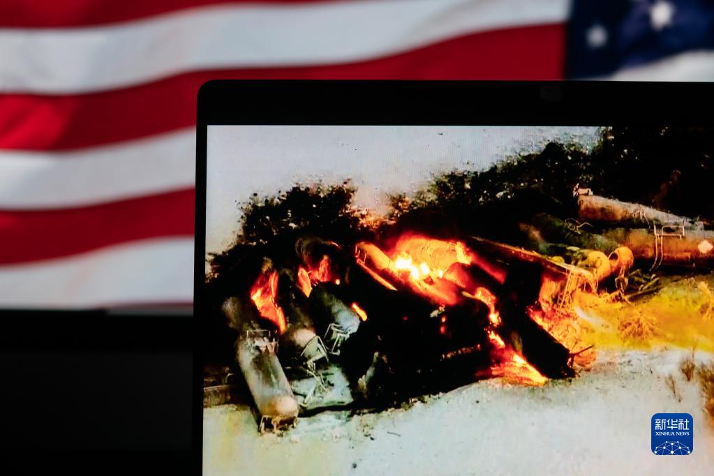 3月30日在美國阿靈頓拍攝的屏幕顯示美國明尼蘇達州貨運列車(chē)脫軌事故現場(chǎng)畫(huà)面。