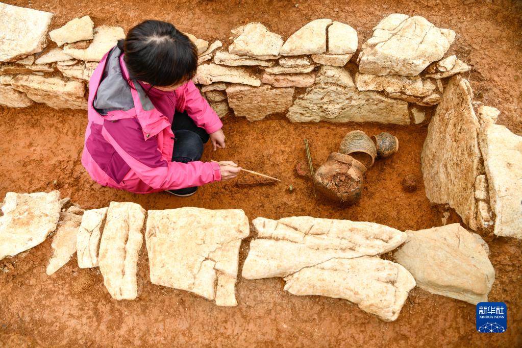 3月30日,在貴州貴安新區大松山墓群挖掘現場(chǎng),貴州省文物考古研究所所長(cháng)周必素在介紹出土文物情況。