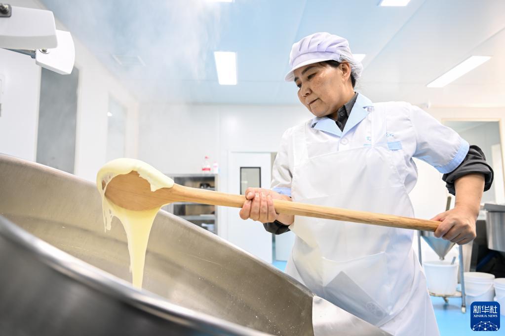 3月31日,在鑲黃旗民族傳統奶制品產(chǎn)業(yè)園的一家奶制品企業(yè)生產(chǎn)車(chē)間,工作人員在攪拌制作奶豆腐。