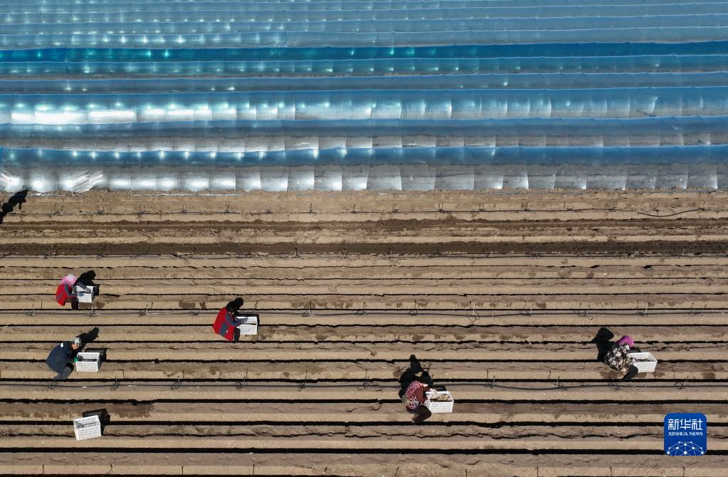 3月31日,唐山市豐潤區新軍屯鎮的農民在田間種植生姜(無(wú)人機照片)。