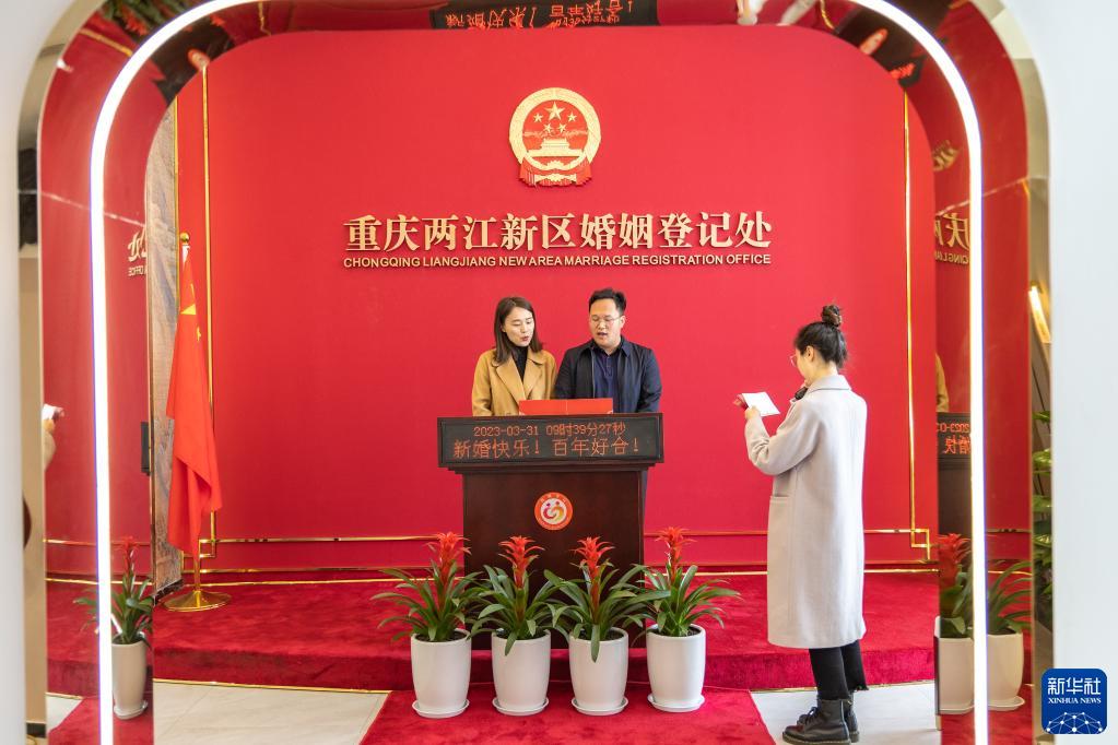 3月31日,在重慶市兩江新區婚姻登記處的頒證廳,一對新人在頒證人員的見(jiàn)證下宣讀結婚誓言。