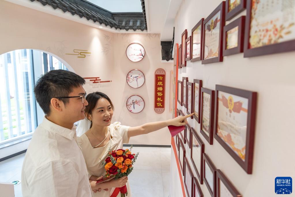 3月31日,在重慶市兩江新區婚姻登記處,新人領(lǐng)取結婚證后參觀(guān)婚俗文化展廳。