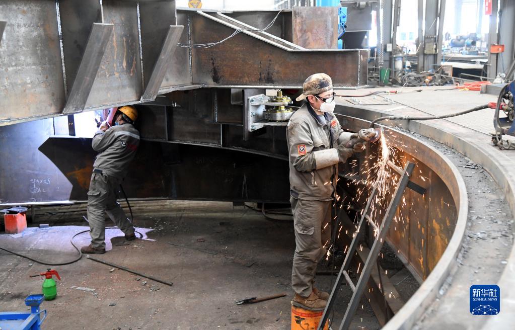 3月29日,山東省新泰市一家起重機械公司的工作人員在加工起重機底盤(pán)。