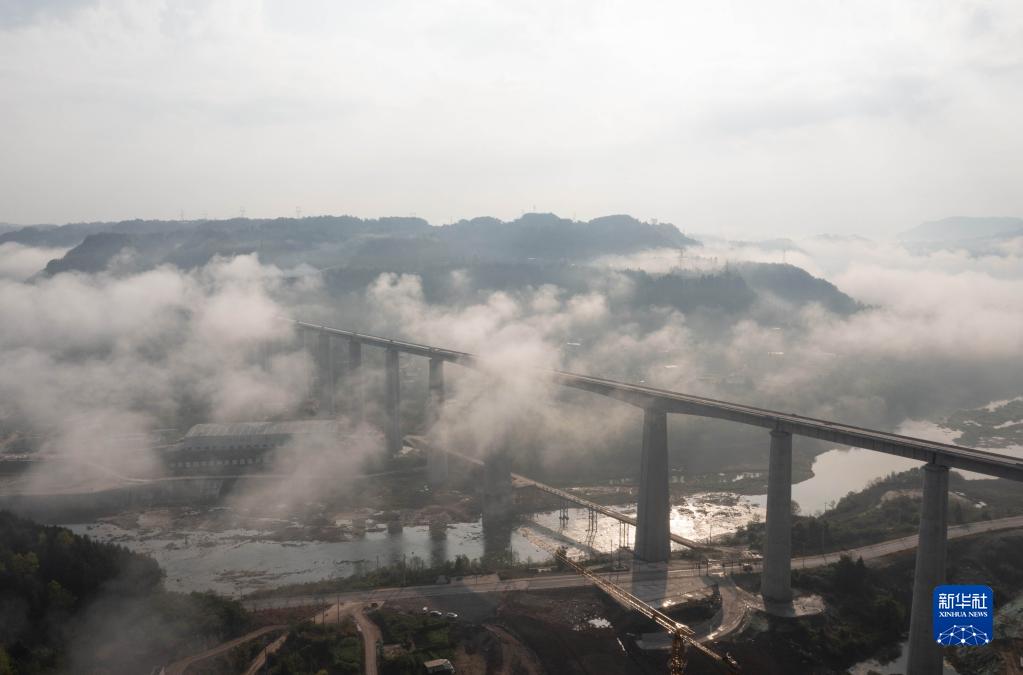俯瞰云霧中的漢巴南鐵路恩陽(yáng)河特大橋(3月30日攝,無(wú)人機照片)。