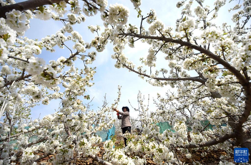 3月31日,山東省淄博市沂源縣燕崖鎮雙泉村的果農為大櫻桃花授粉。