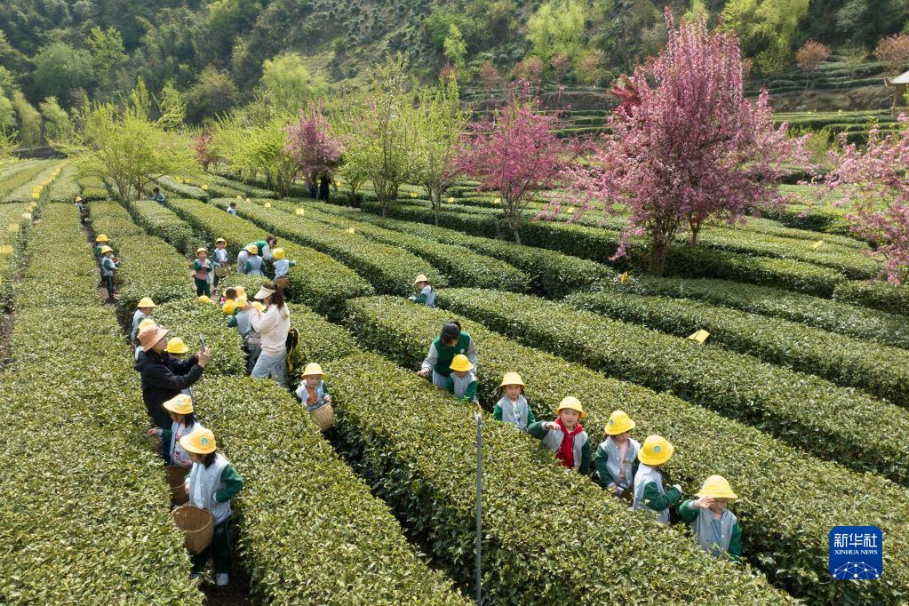 3月31日,在安康市漢濱區大竹園鎮一處茶園內,小朋友在老師的帶領(lǐng)下進(jìn)行采茶體驗活動(dòng)。
