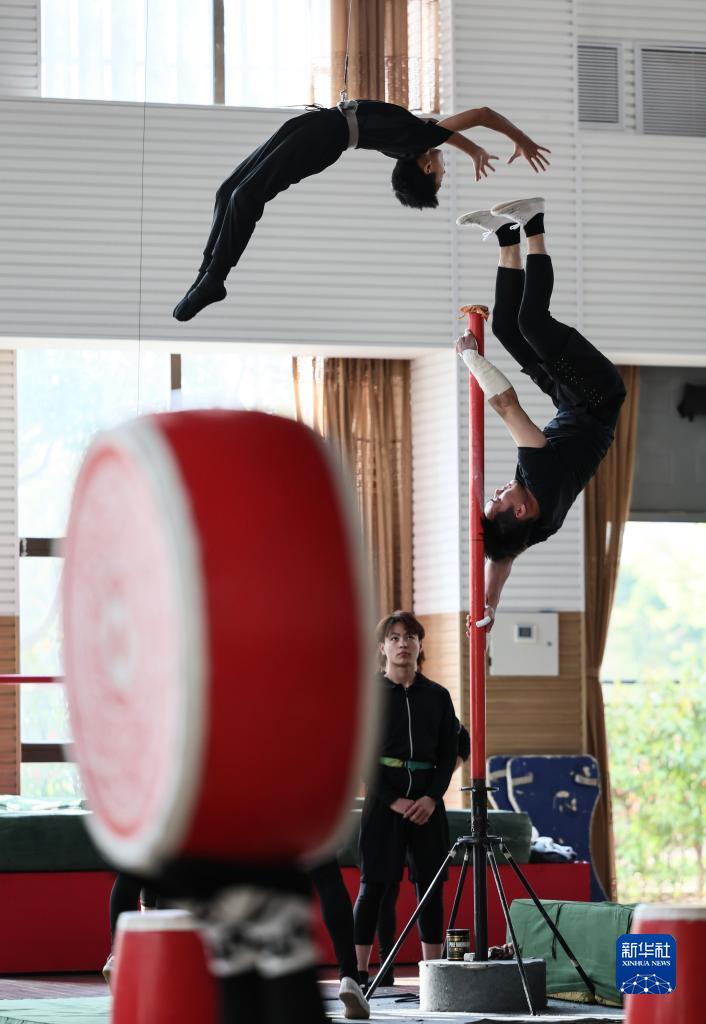 3月31日,演員們在位于江蘇省鹽城市建湖縣的江蘇省雜技團訓練。