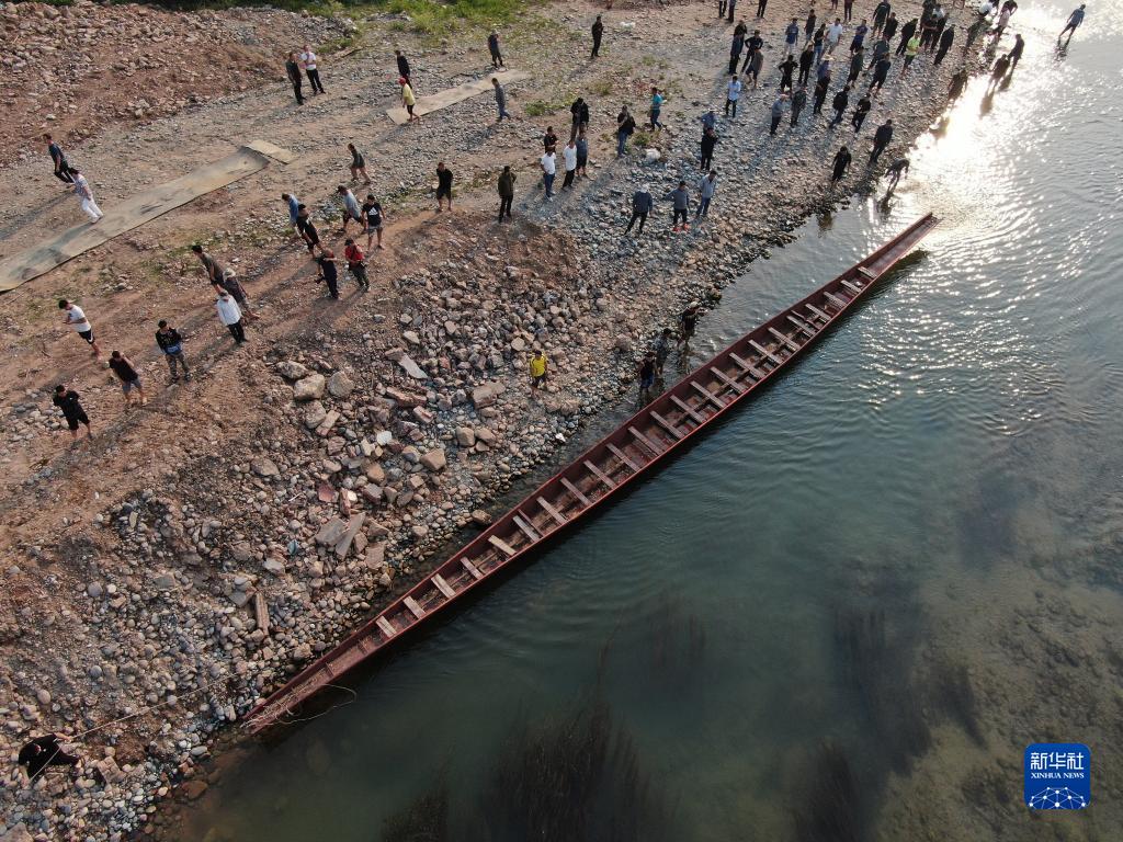 4月1日,景洪市勐罕鎮曼聽(tīng)村村民推送龍舟進(jìn)入瀾滄江(無(wú)人機照片)。