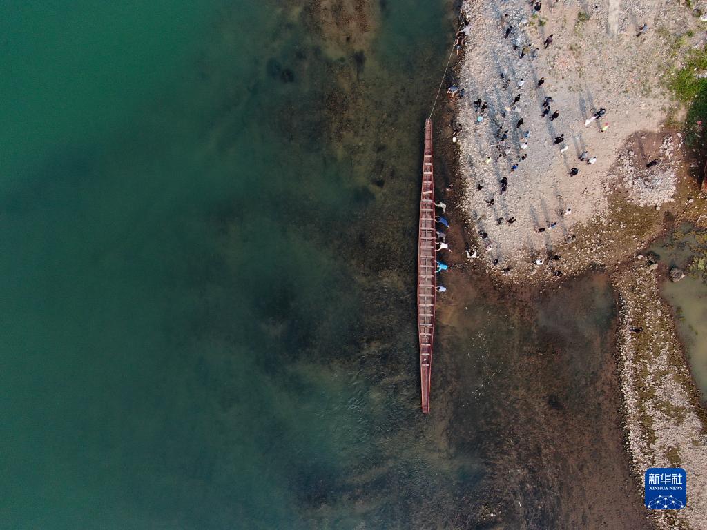 4月1日,景洪市勐罕鎮曼聽(tīng)村村民推送龍舟進(jìn)入瀾滄江(無(wú)人機照片)。