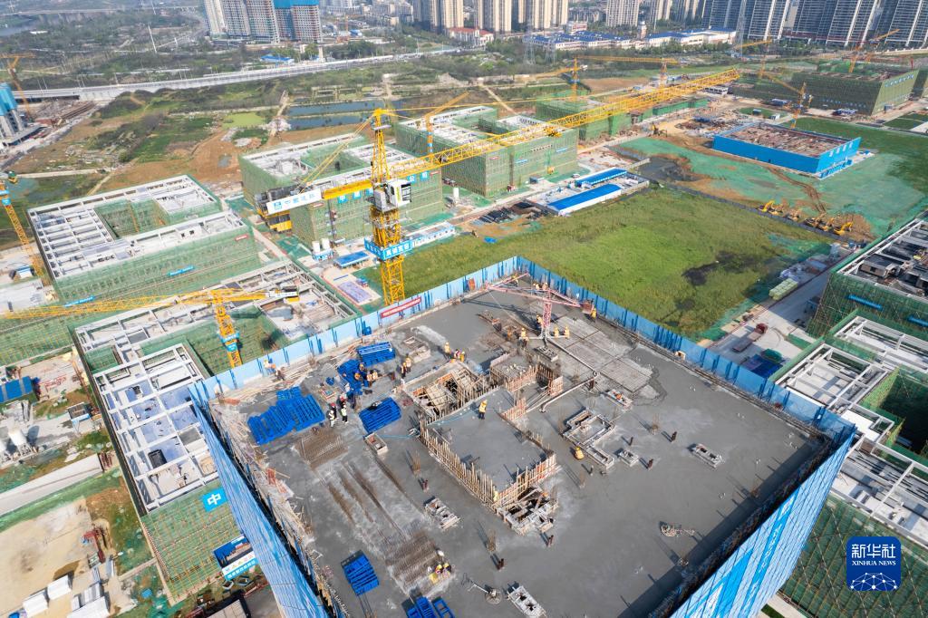 4月1日,在長(cháng)沙岳麓山實(shí)驗室集聚區農大片區項目建設現場(chǎng),工人在進(jìn)行封頂施工作業(yè)(無(wú)人機照片)。