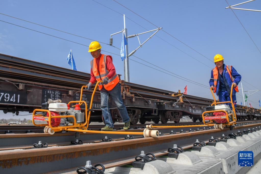 4月1日,中鐵四局集團工作人員在萊榮鐵路鋪軌施工現場(chǎng)鋪設軌道。