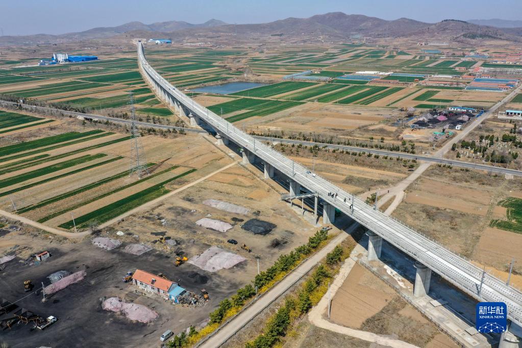 鳥(niǎo)瞰萊榮鐵路跨威青高速特大橋段(3月31日攝,無(wú)人機照片)。