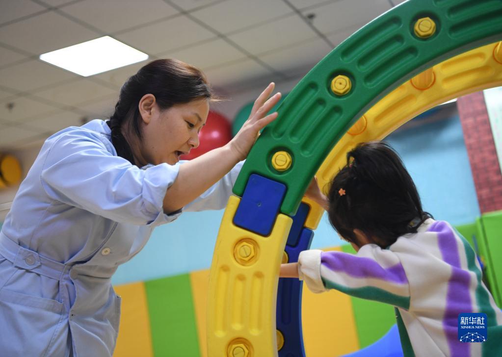 3月30日,在西安市金色陽(yáng)光康復中心,特教老師為孩子進(jìn)行康復訓練。