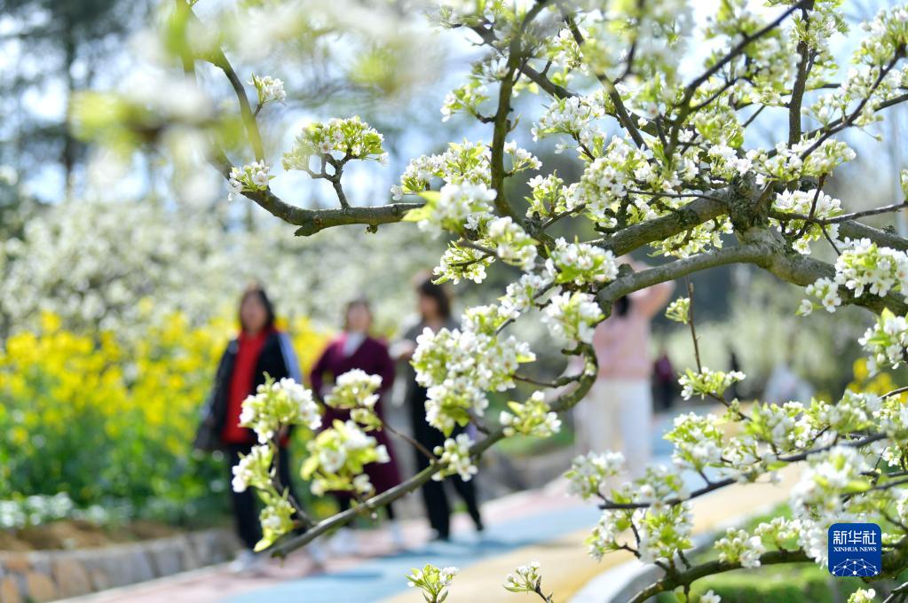 4月1日,游人在宣恩縣椒園鎮黃坪村的黃金梨園里游玩。