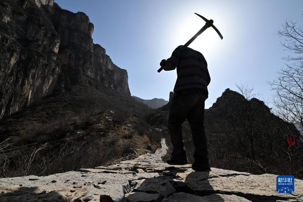 在山西省壺關(guān)縣大峽谷鎮青龍峽村,村民在山上修路(3月8日攝)。