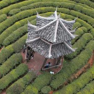 4月1日,村民在岑鞏縣天馬鎮一茶葉種植基地采摘明前茶(無(wú)人機照片)。