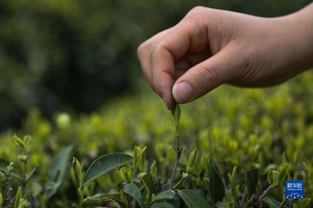 4月1日,村民在岑鞏縣天馬鎮一茶葉種植基地采摘明前茶。