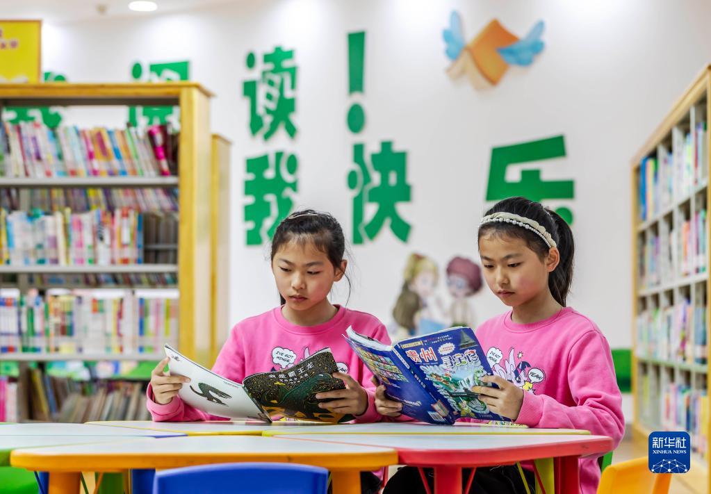 4月1日,一對孿生姐妹在貴州省黔西市圖書(shū)館少兒閱覽室閱讀圖書(shū)。