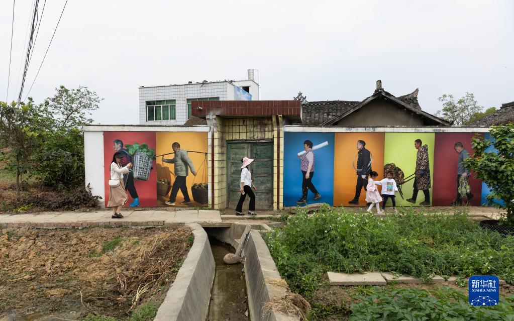 這是在寶勝村村屋墻壁上展出的影像藝術(shù)作品(4月1日攝)。