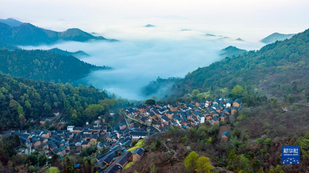 云霧繚繞的山村春景(4月1日攝,無(wú)人機照片)。
