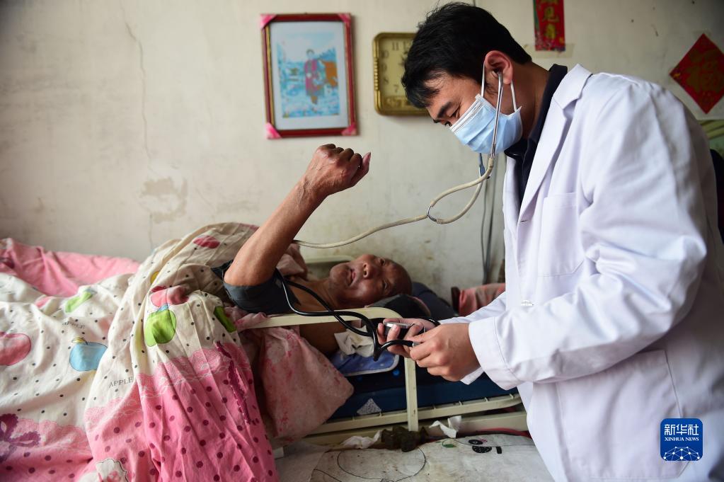 4月1日,鹽山縣孟店鎮高金村大學(xué)生村醫馮壽軍到患者家中出診。