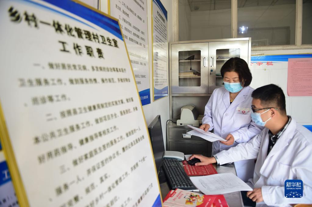 4月1日,鹽山縣孟店鎮東大辛村大學(xué)生村醫趙磊(右)在村衛生室整理村民健康檔案。