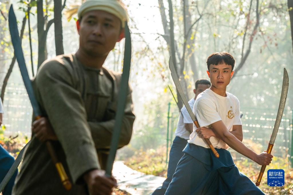 耿馬縣民族歌舞團演員宰細(右)在練習刀舞(3月23日攝)。