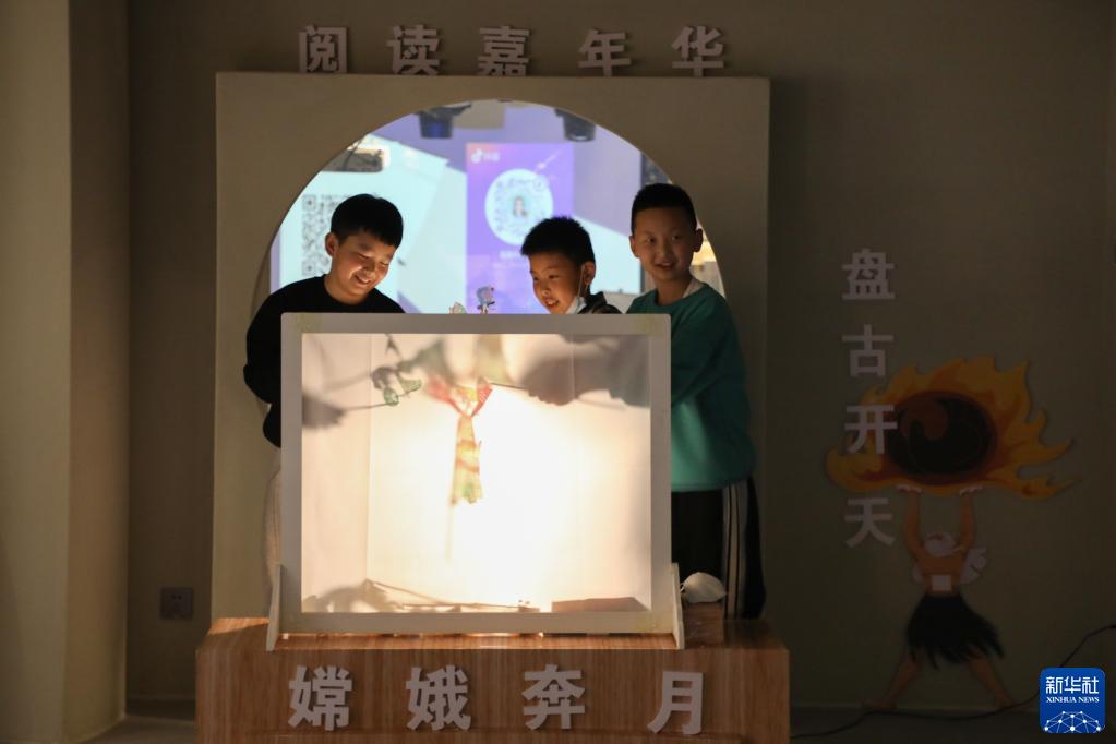 4月1日,在甘肅省蘭州市的讀者出版集團數字閱讀中心讀者小站,小朋友體驗中國神話(huà)故事主題皮影戲。