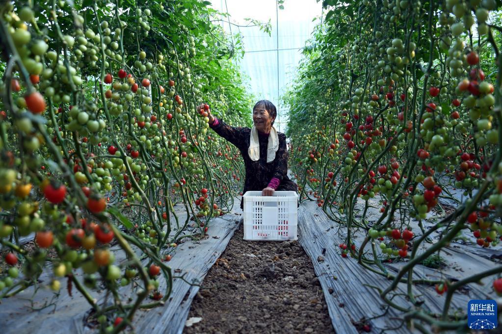 4月1日,在山東省棗莊市臺兒莊區馬蘭屯鎮按揭農業(yè)基地,菜農在采摘西紅柿。