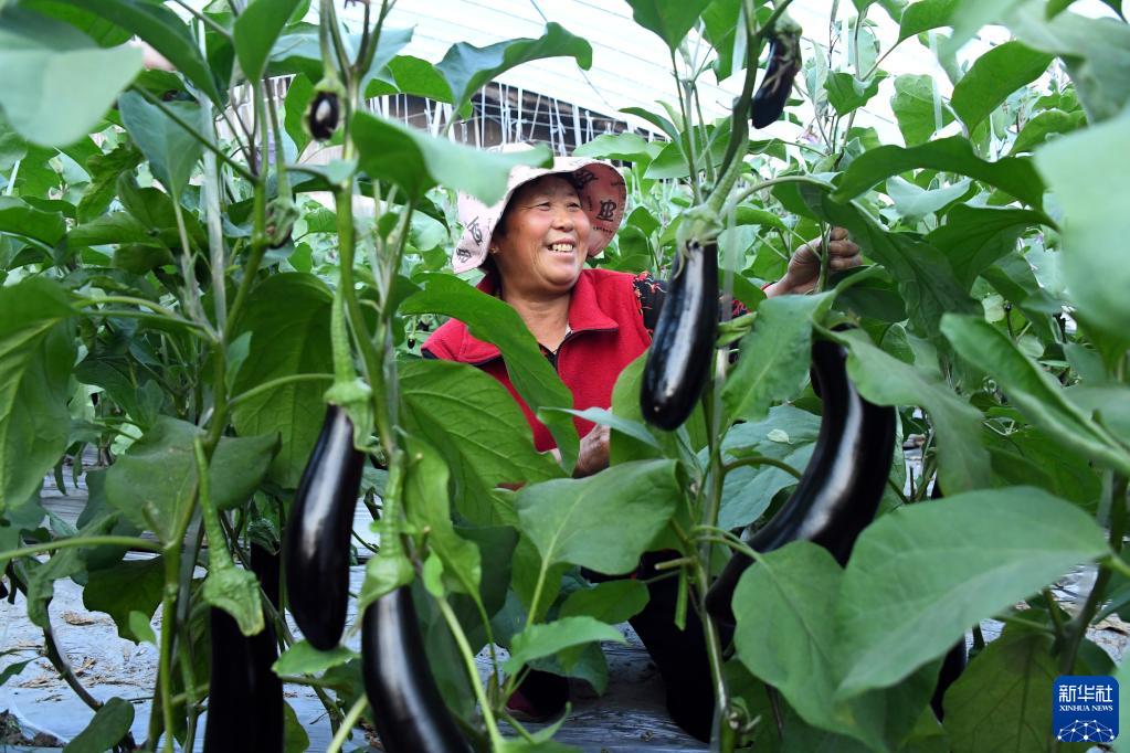4月1日,在山東省棗莊市臺兒莊區馬蘭屯鎮按揭農業(yè)基地,菜農在采摘大棚茄子。