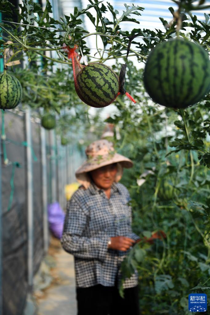 4月1日,在山東省棗莊市臺兒莊區馬蘭屯鎮按揭農業(yè)基地,菜農們在管理大棚西瓜。