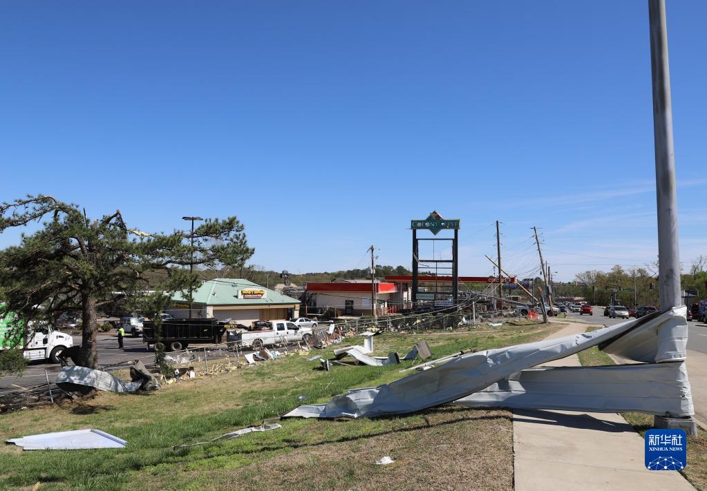 這是4月1日在美國阿肯色州小石城拍攝的龍卷風(fēng)襲擊后的景象。