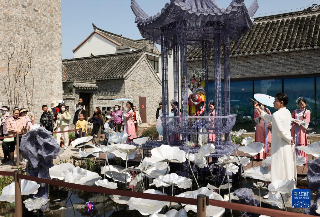 4月1日,游客在位于江蘇省鹽城市建湖縣的淮劇小鎮觀(guān)看淮劇表演。