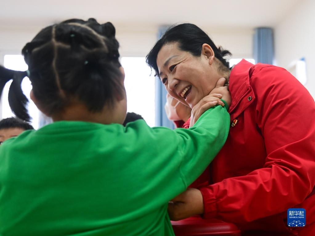 3月30日,在青海省西寧市星光特殊兒童服務(wù)中心,陳志芳(右)給一名孤獨癥兒童做康復訓練。