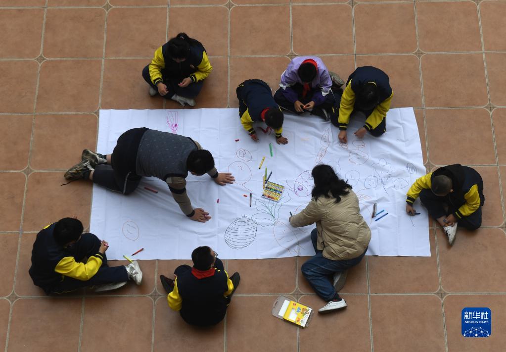 在廣西南寧高新區龍華學(xué)校,何冬艷教學(xué)生畫(huà)畫(huà)(3月31日攝)。