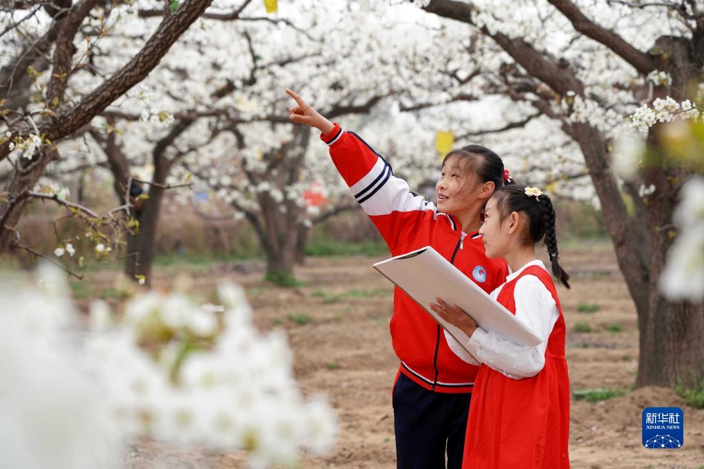 4月2日,小朋友在臨城縣北程村百年梨園寫(xiě)生。