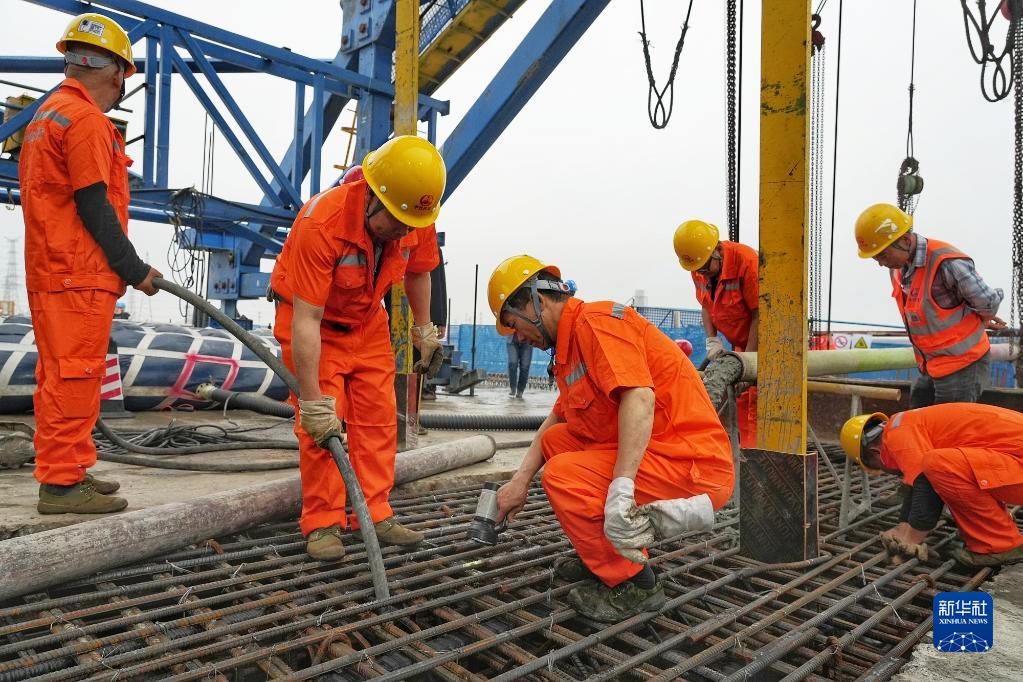 4月2日,施工人員在東莞槎馬特大橋主跨合龍段澆筑混凝土。