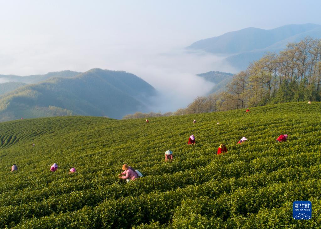 4月2日,采茶工在浙江省湖州市安吉縣杭垓鎮的生態(tài)茶園里采摘明前茶(無(wú)人機照片)。