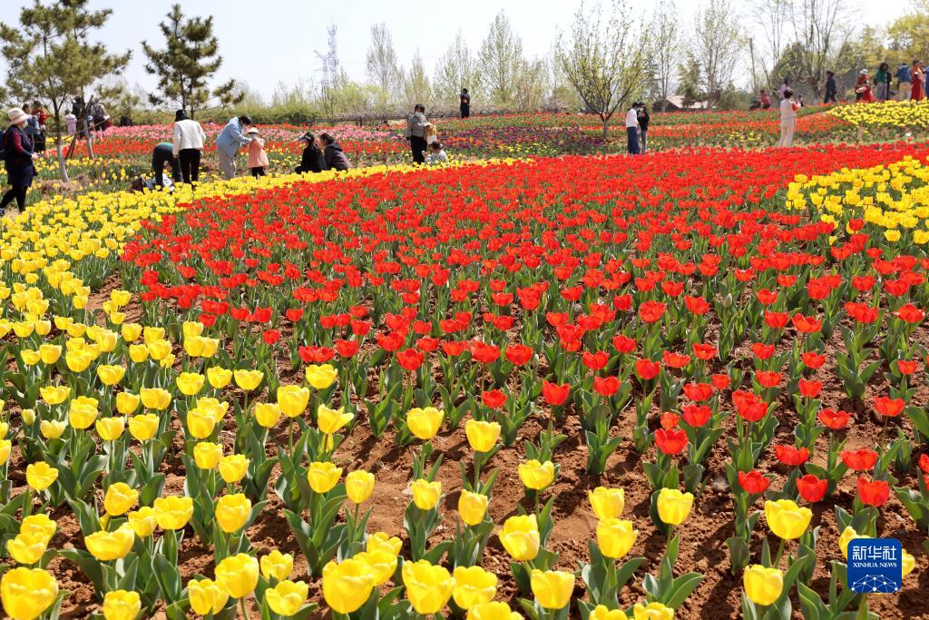 4月2日,人們在山東省棗莊市永安鎮蓮花山郁金香園賞花游玩。