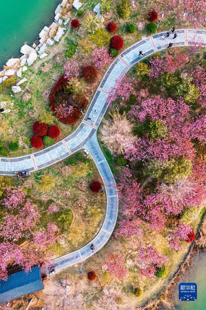 4月1日,人們在河南省商丘市日月湖景區櫻花島賞櫻游玩(無(wú)人機照片)。