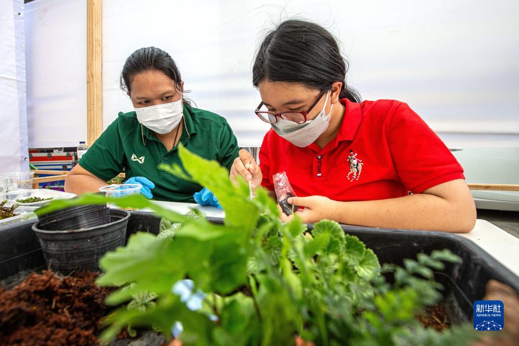 4月2日,在位于曼谷的泰國孤獨癥職業(yè)中心,一名孤獨癥患者(右)學(xué)習制作綠植盆景。