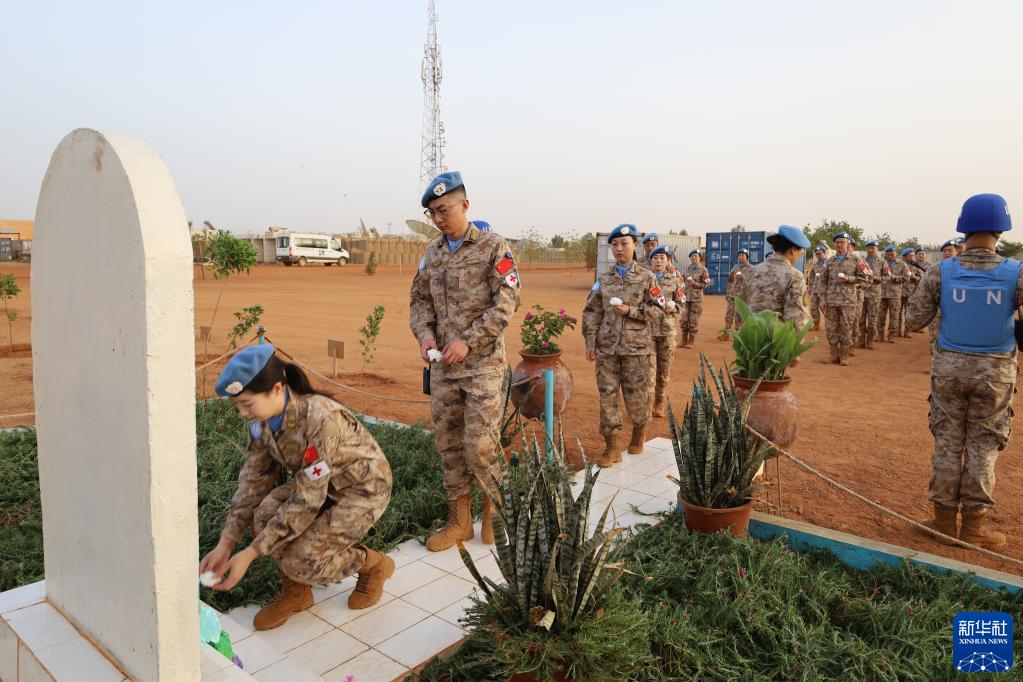 中國第十批赴馬里維和醫療分隊當日在聯(lián)合國駐馬里多層面綜合穩定特派團(馬里穩定團)東戰區加奧超營(yíng)的維和烈士廣場(chǎng)開(kāi)展清明祭掃活動(dòng),悼念藍盔忠魂。