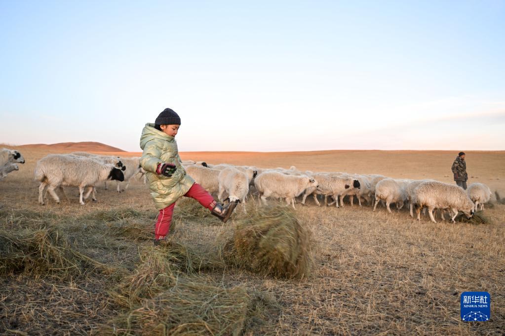 3月29日清晨,朝克德力根的女兒在草場(chǎng)上踢草垛。這是為了讓牧草更加分散,方便羊群進(jìn)食。