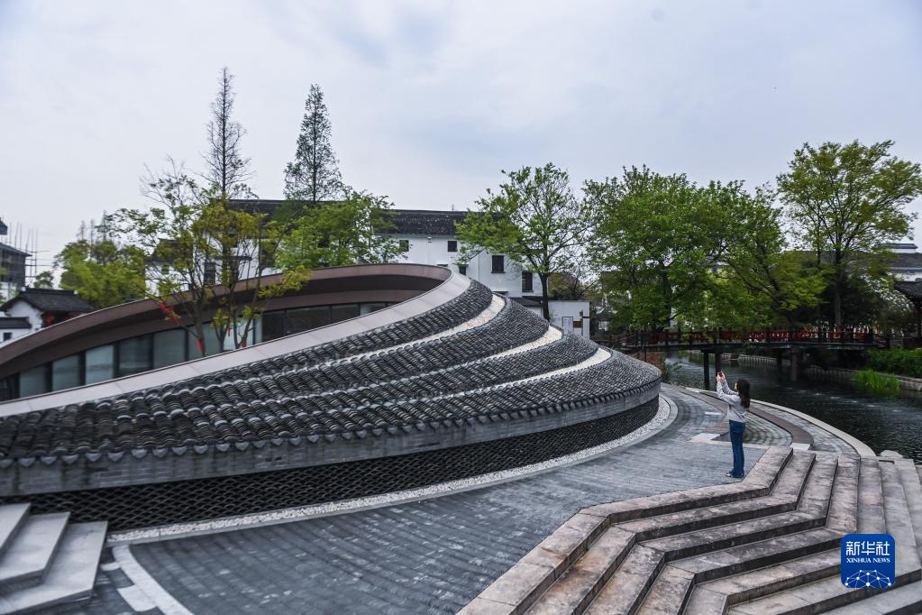 4月3日,游客在嘉興市秀洲區王店鎮鎮中村的未來(lái)鄉村展示館外拍照留影。