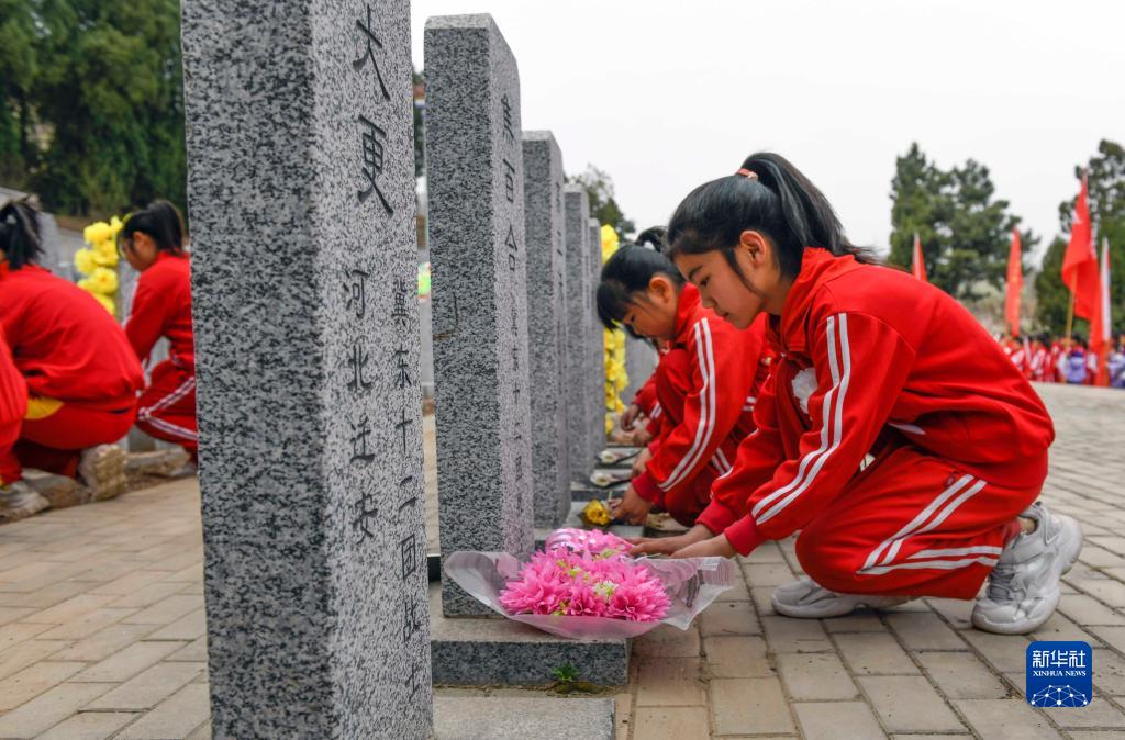 4月3日,學(xué)生在河北省遵化市鐵廠(chǎng)鎮甲山烈士陵園獻花。