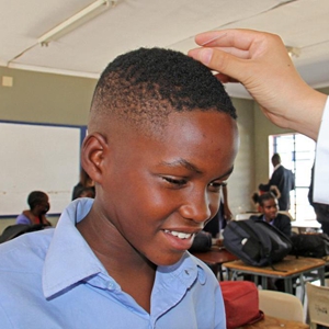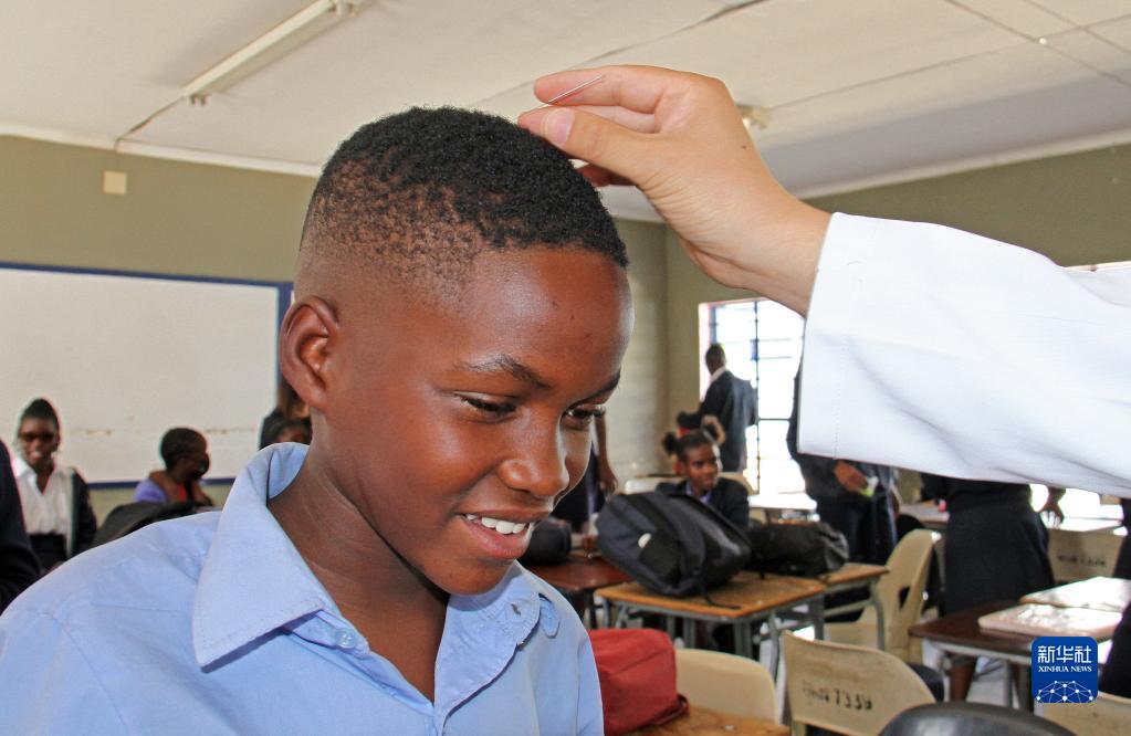 4月3日,在納米比亞溫得和克的伊曼紐爾·謝菲迪中學(xué)課堂上,一名學(xué)生體驗針灸。