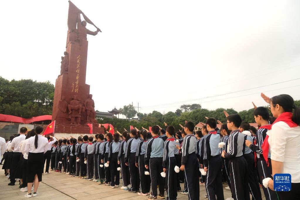 4月4日,少先隊員在位于南寧市的廣西壯族自治區烈士陵園向英雄紀念碑敬禮。