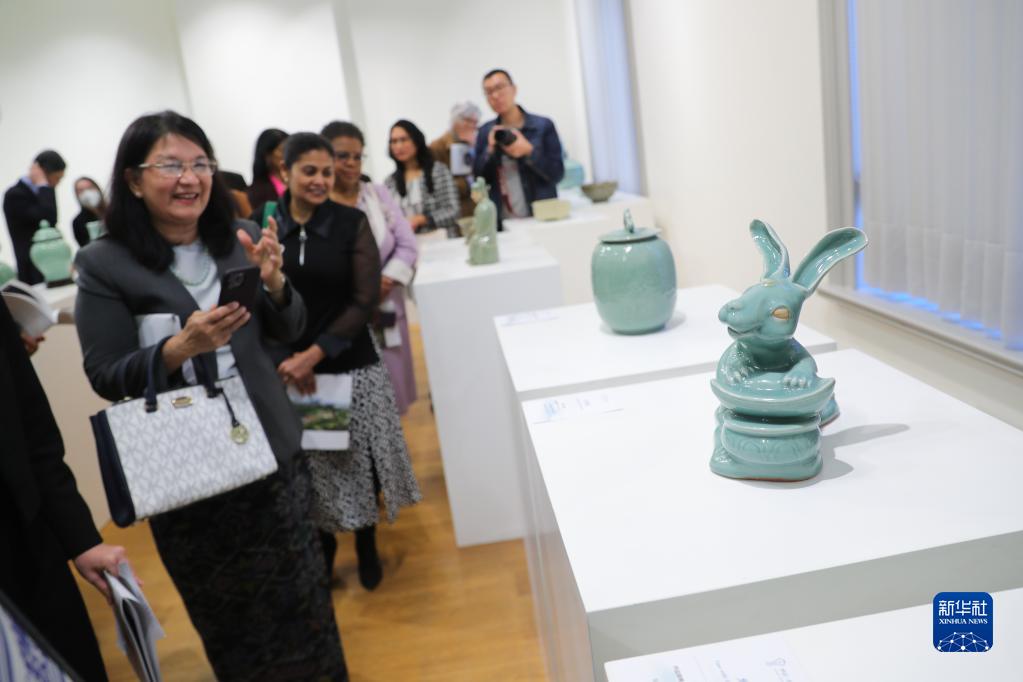 4月3日,在比利時(shí)布魯塞爾,參觀(guān)者在“聽(tīng)瓷語(yǔ) 觀(guān)世界——宋韻龍泉青瓷展”上觀(guān)賞瓷器。